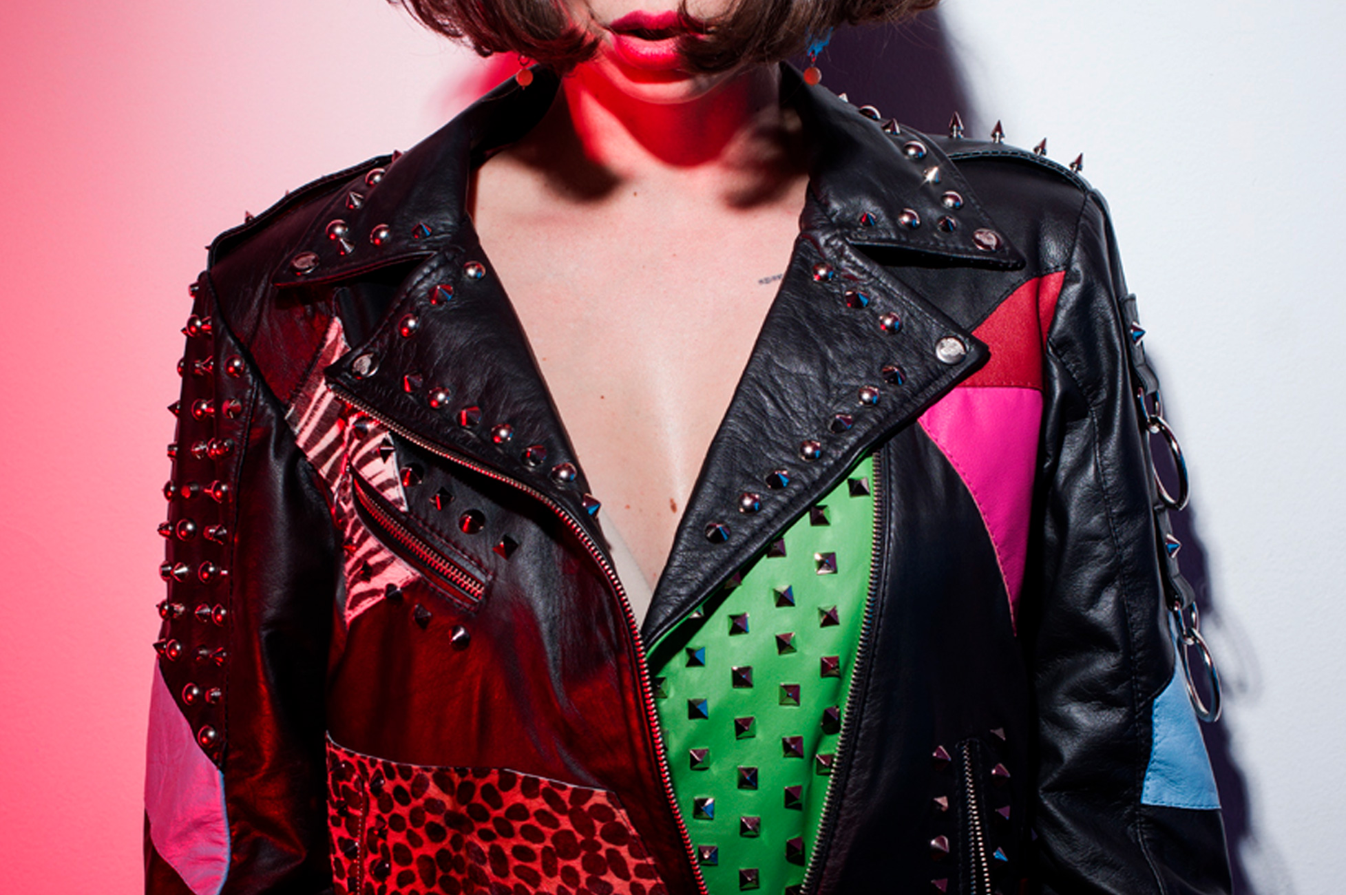 Chamarra en piel natural, suave al tacto, Arte pintado a mano en la espalda por Manuela Restrepo, cremalleras, herrajes y