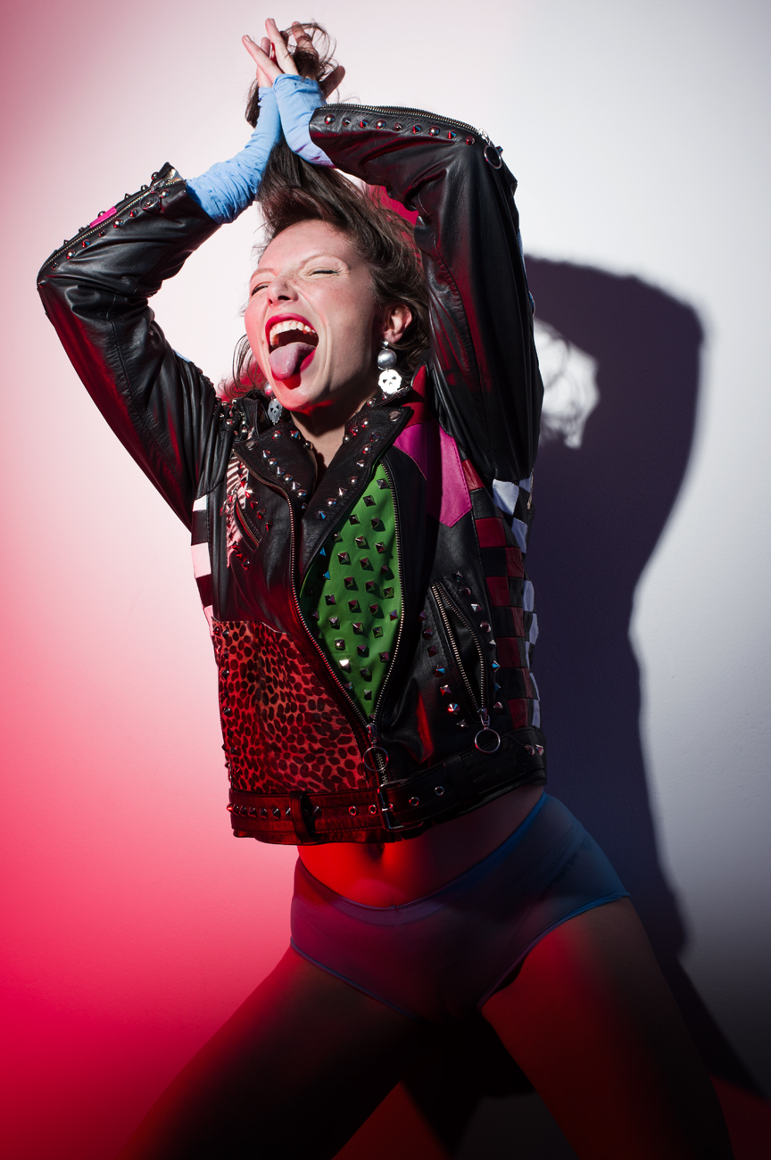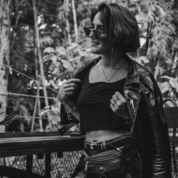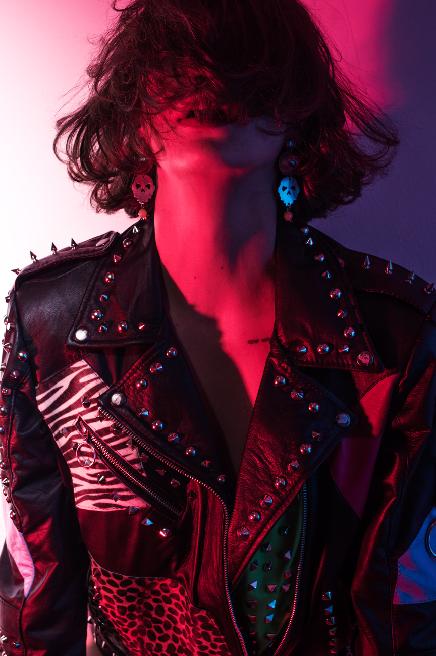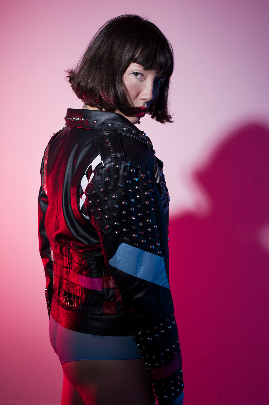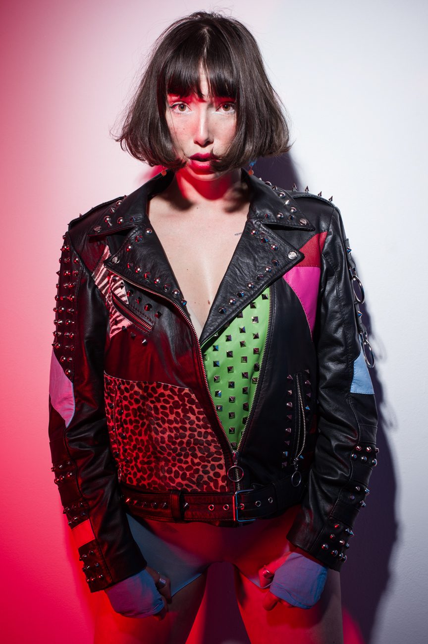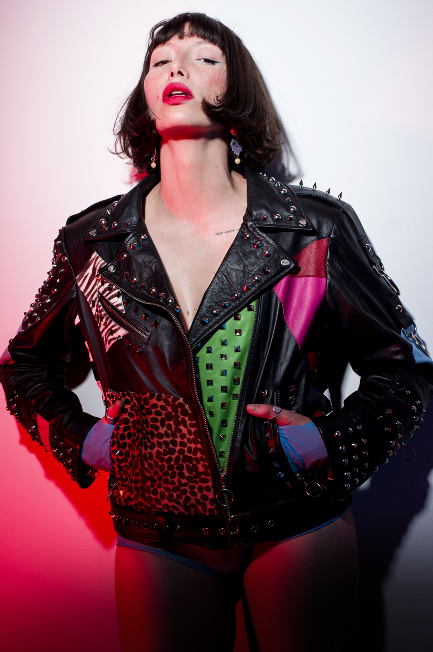 • Chamarra en piel natural, suave al tacto, patchwork completo. Arte pintado a mano en la espalda por Manuela Restrepo, cremalleras, herrajes y remaches en acero inoxidable importados. Joyería en plata ley 950, por la marca 40 Onzas.
