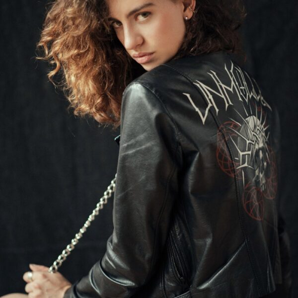 Chamarra en piel natural, suave al tacto, Arte pintado a mano en la espalda por Manuela Restrepo, cremalleras, herrajes y