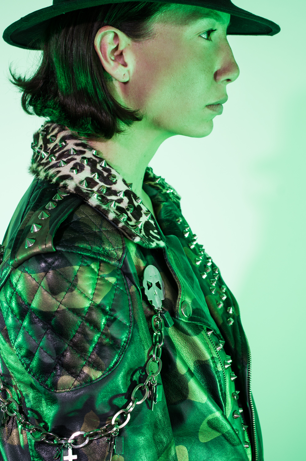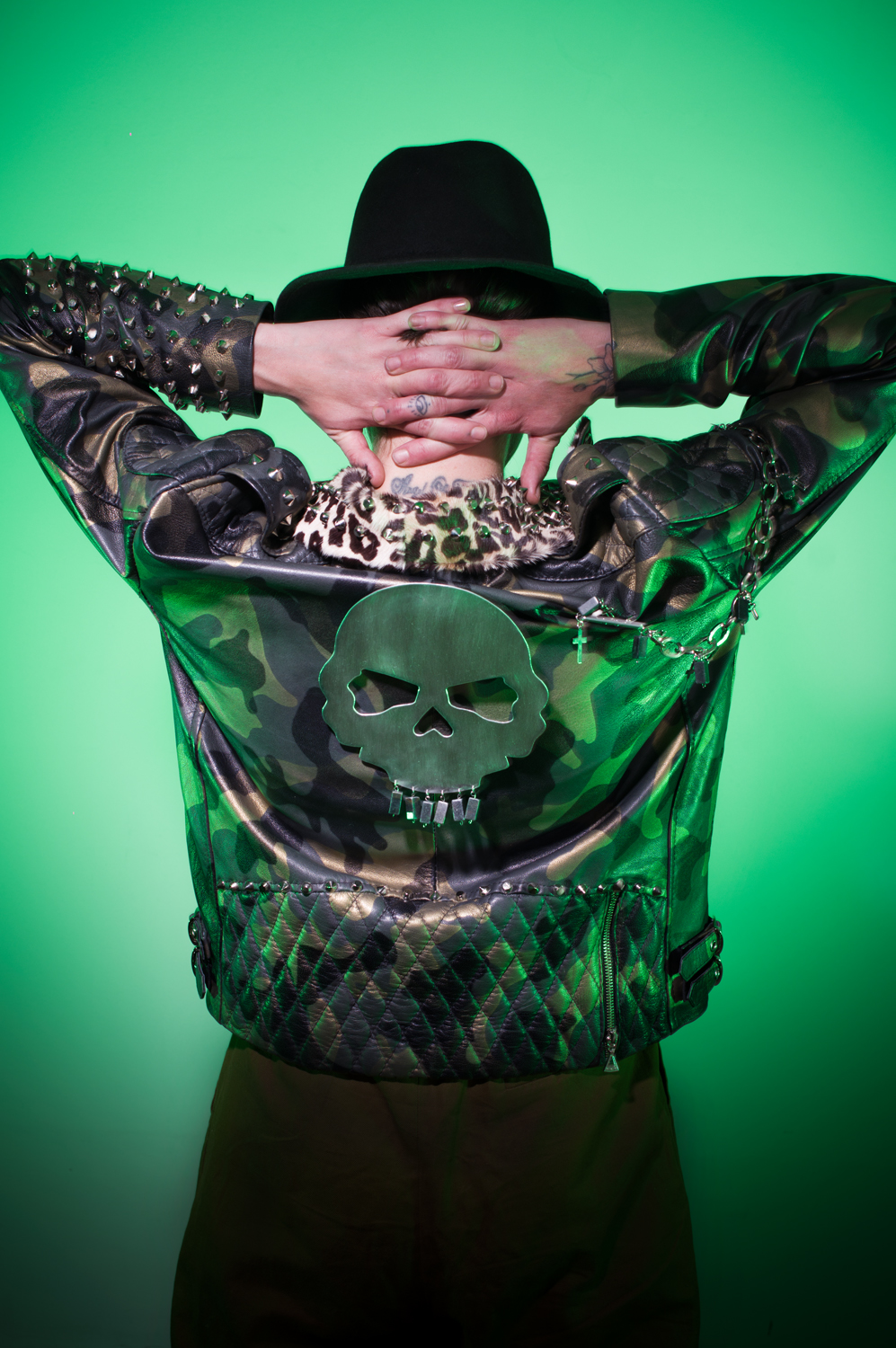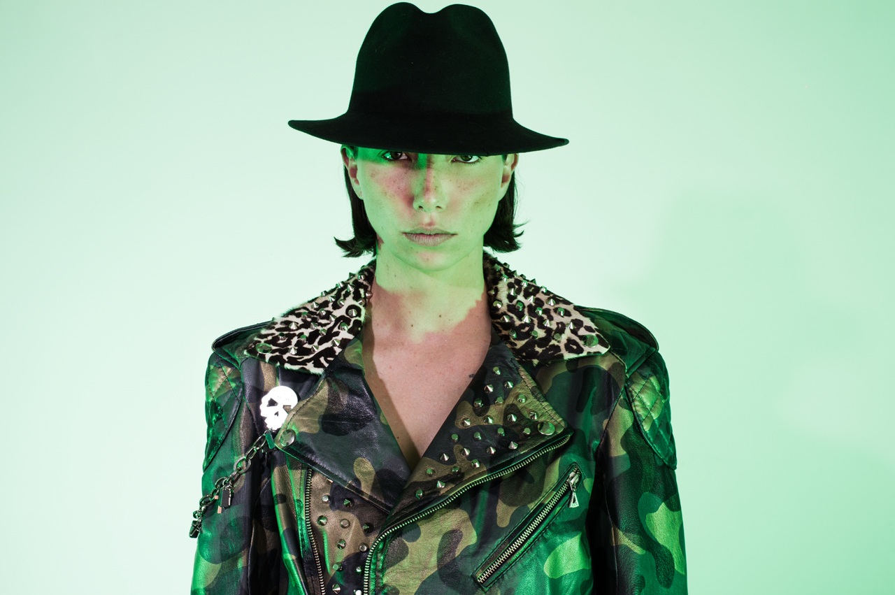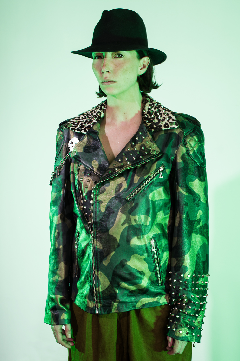Con cremalleras, herrajes, y remaches en acero inoxidable. Cuello en piel de res con pelaje original y un estampado animal print.