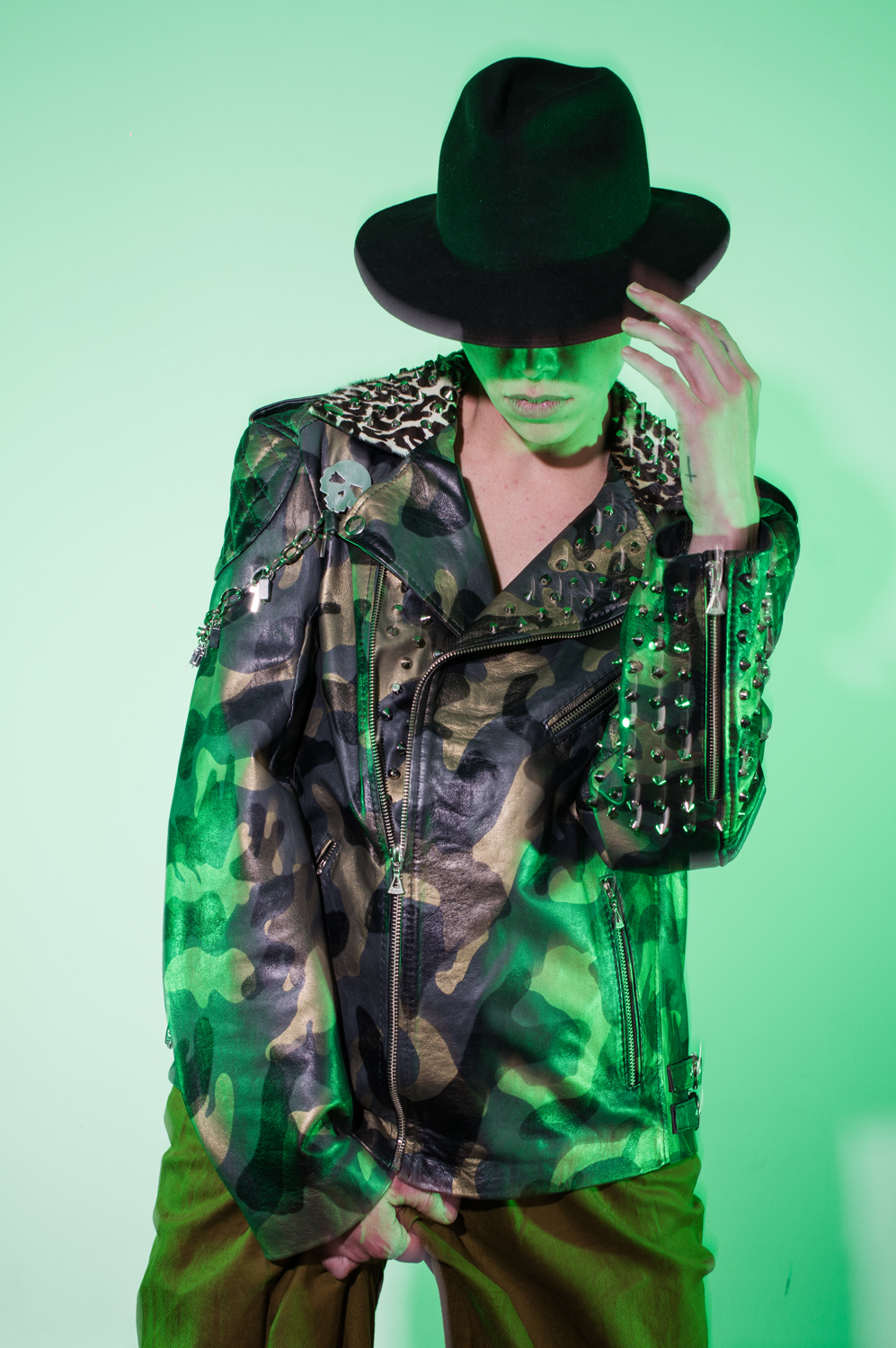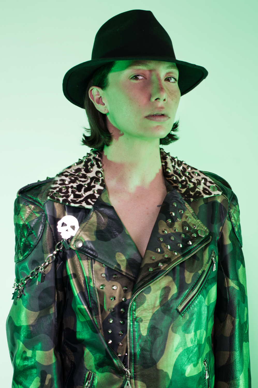 Chamarra en piel de ovejo con proceso de estampación camuflado. Suave al tacto Calibre delgado.