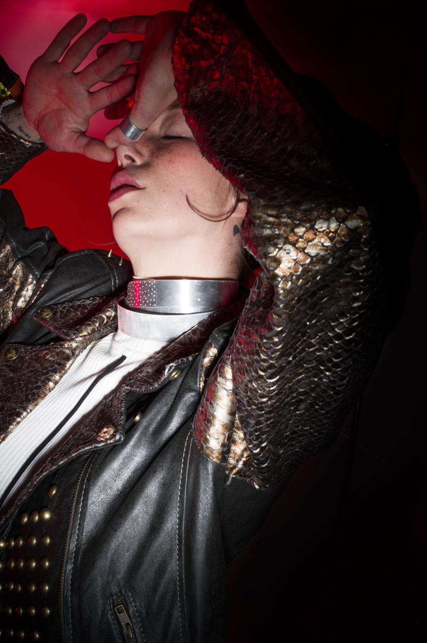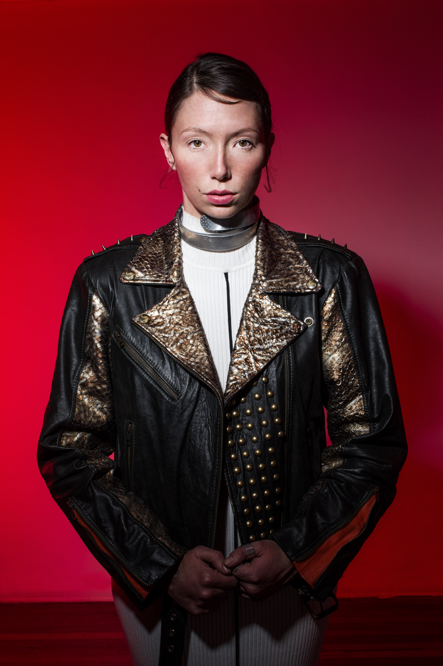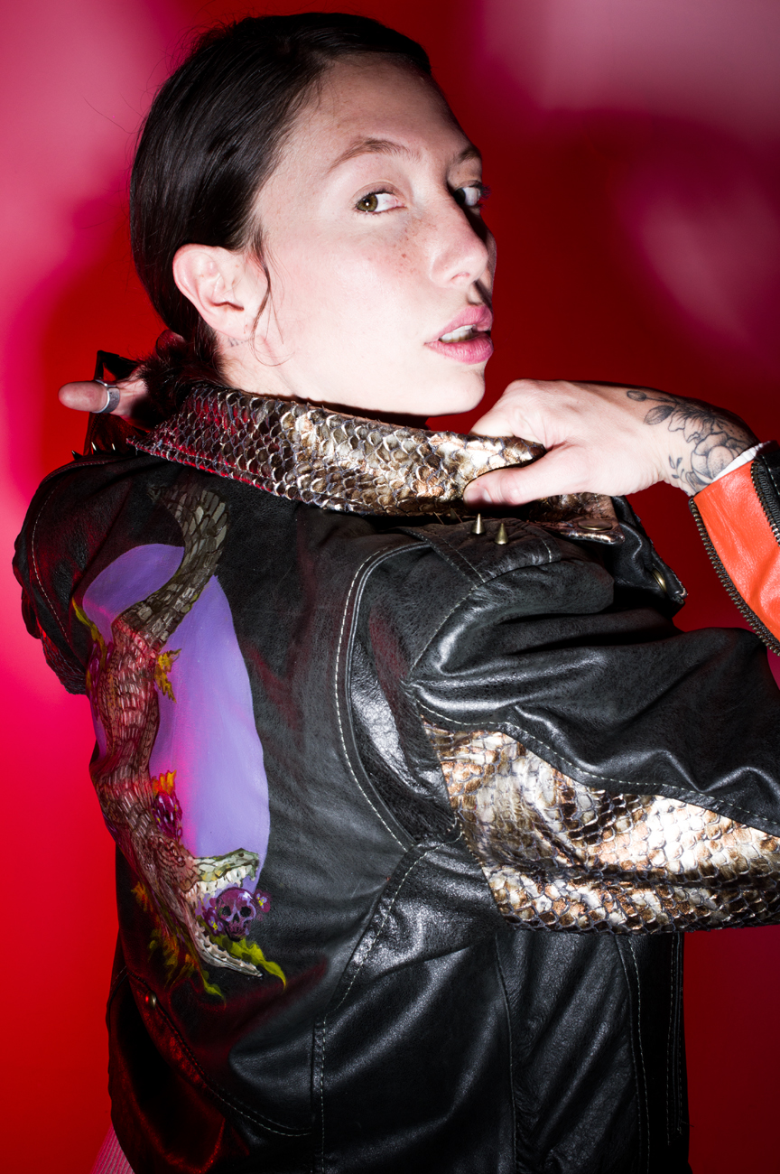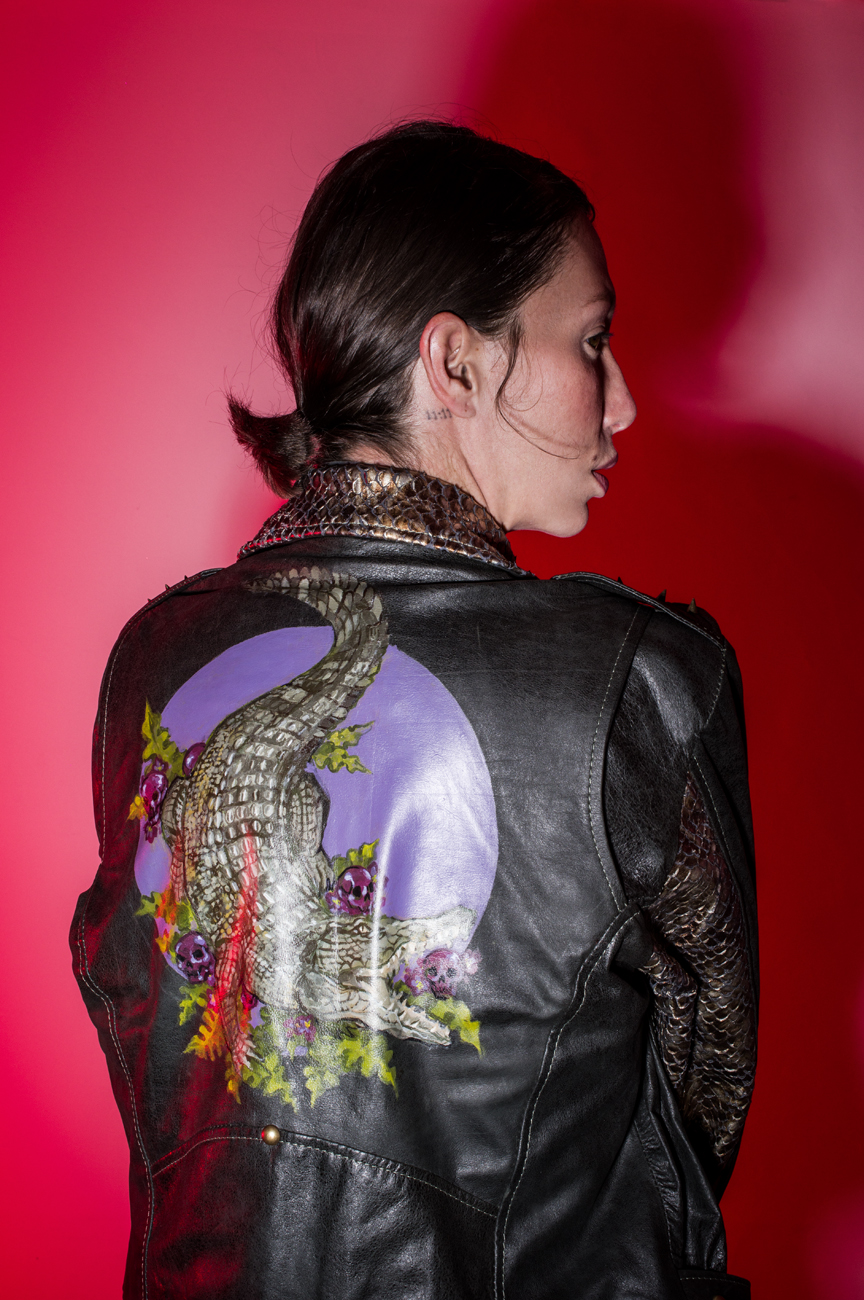 Chamarra en piel natural, suave al tacto, Arte pintado a mano en la espalda por Manuela Restrepo, cremalleras, herrajes y remaches en acero inoxidable importados. Joyería por la marca 40 Onzas.