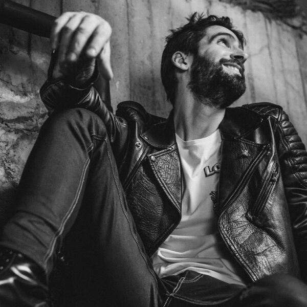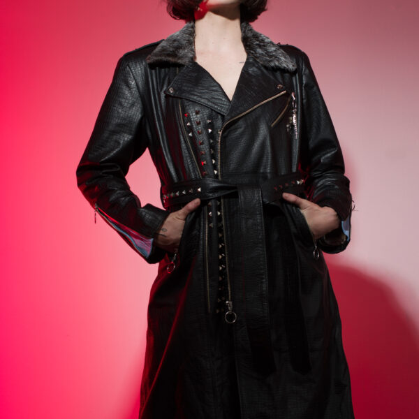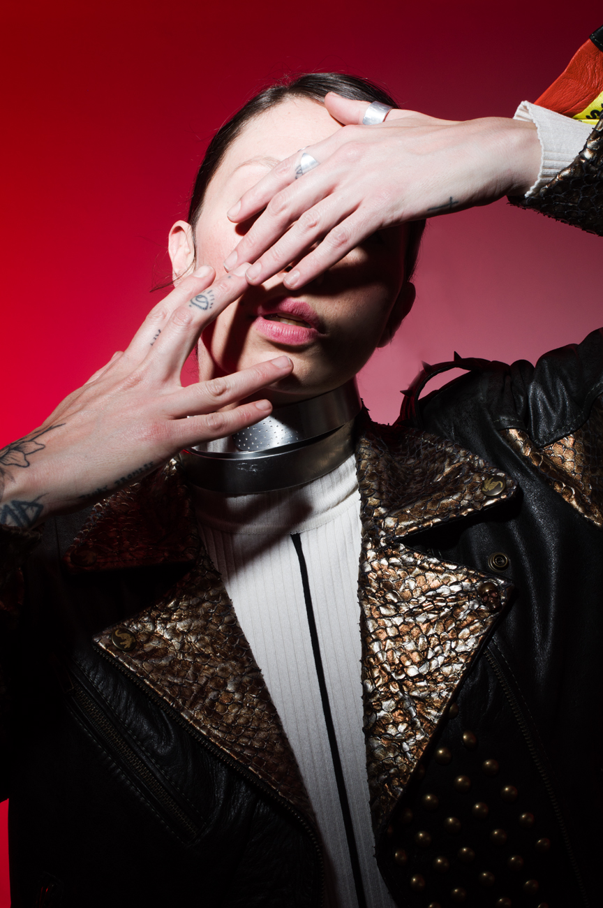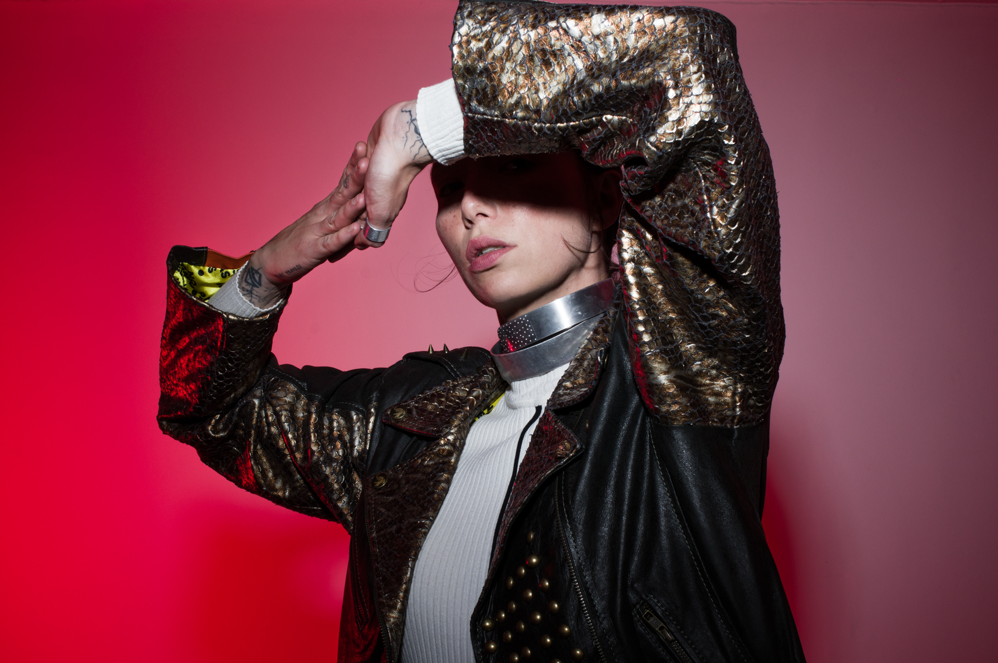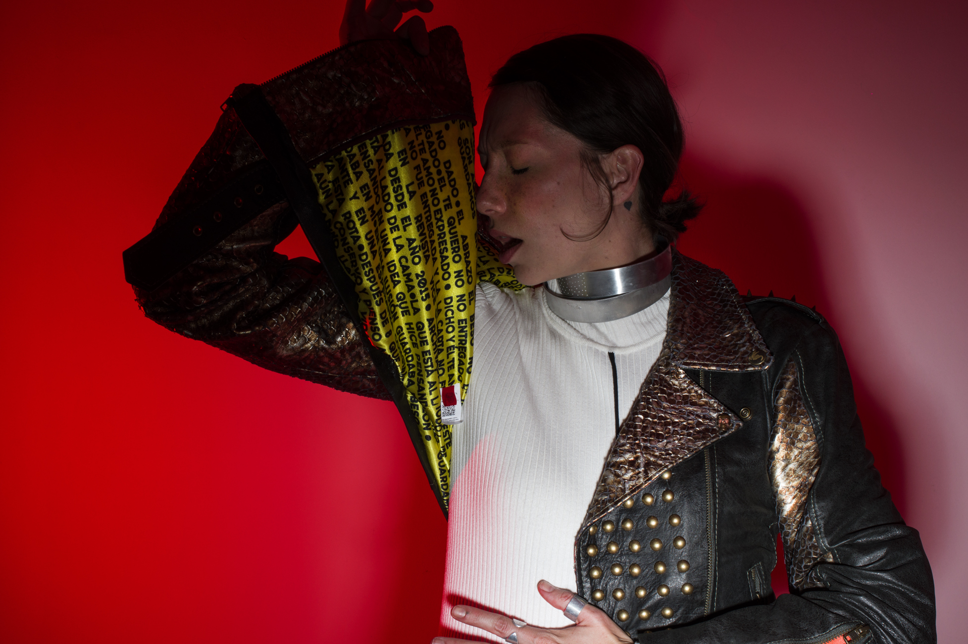 Chamarra en piel natural, suave al tacto, Arte pintado a mano en la espalda por Manuela Restrepo, cremalleras, herrajes y remaches en acero inoxidable importados. Joyería por la marca 40 Onzas.
