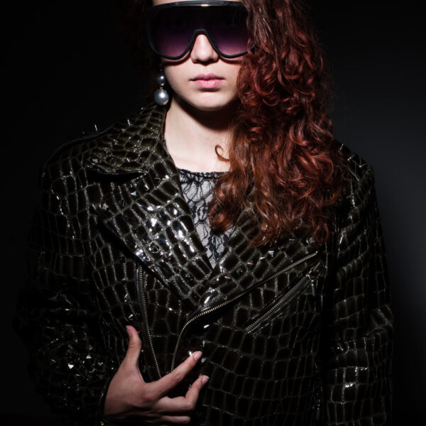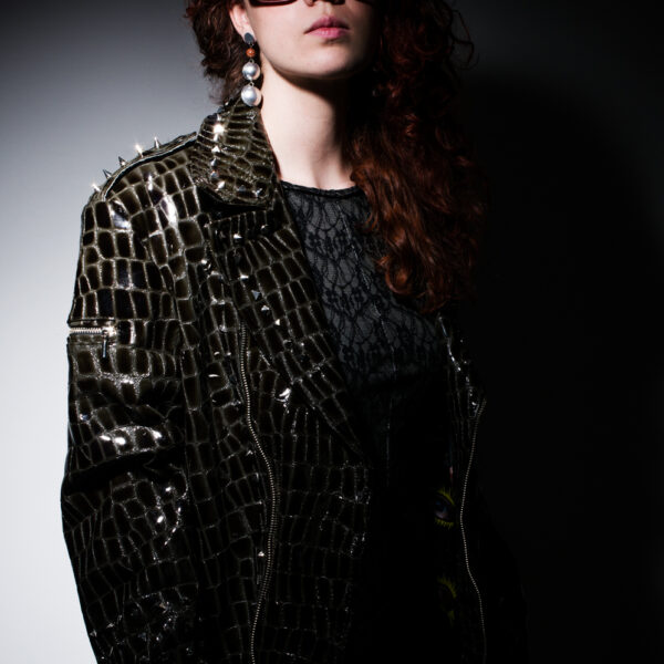 Chamarra en piel natural con textura animal y brillante. Calibre grueso, suave al tacto, con cremalleras, herrajes y remaches de