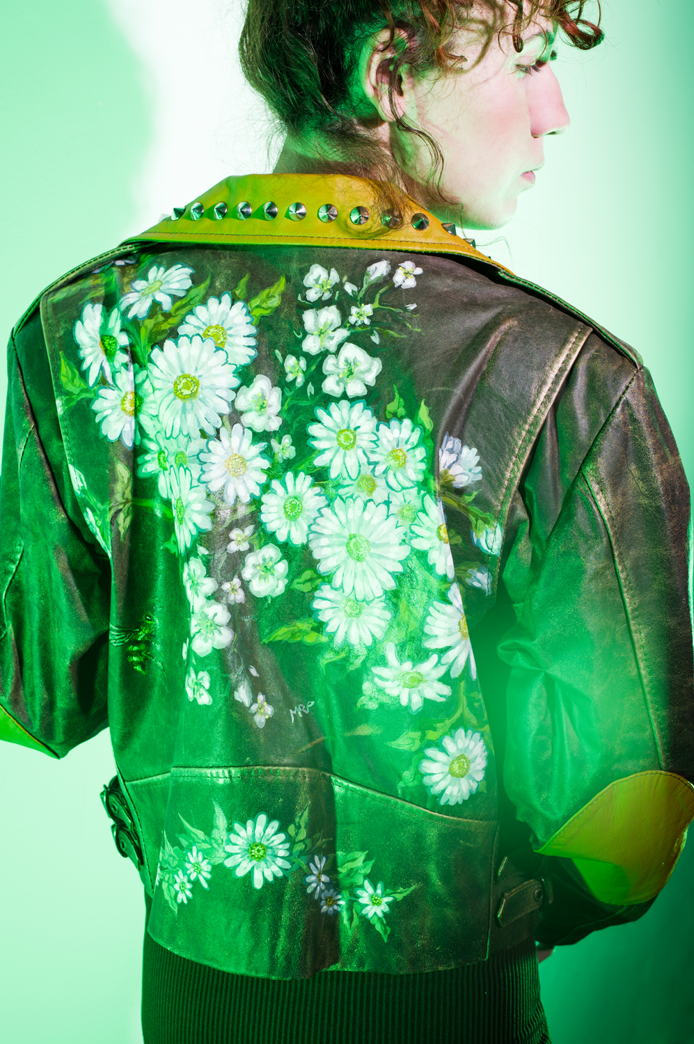 Chamarra en piel natural, suave al tacto, Arte pintado a mano en la espalda por Manuela Restrepo, cremalleras, herrajes y
