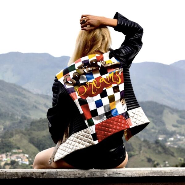 Chamarra en piel natural, suave al tacto, patchwork completo. Arte pintado a mano en la espalda por Manuela Restrepo, cremalleras,