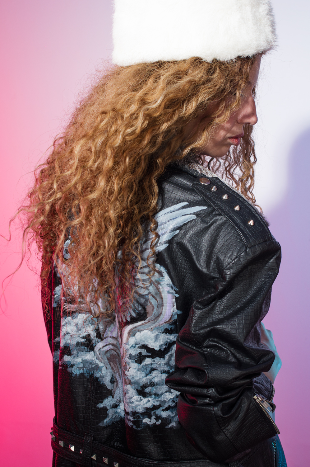 Chamarra en piel natural, suave al tacto, Arte pintado a mano en la espalda por Manuela Restrepo, cremalleras, herrajes y