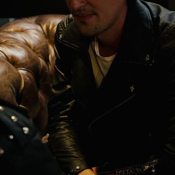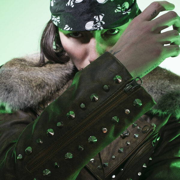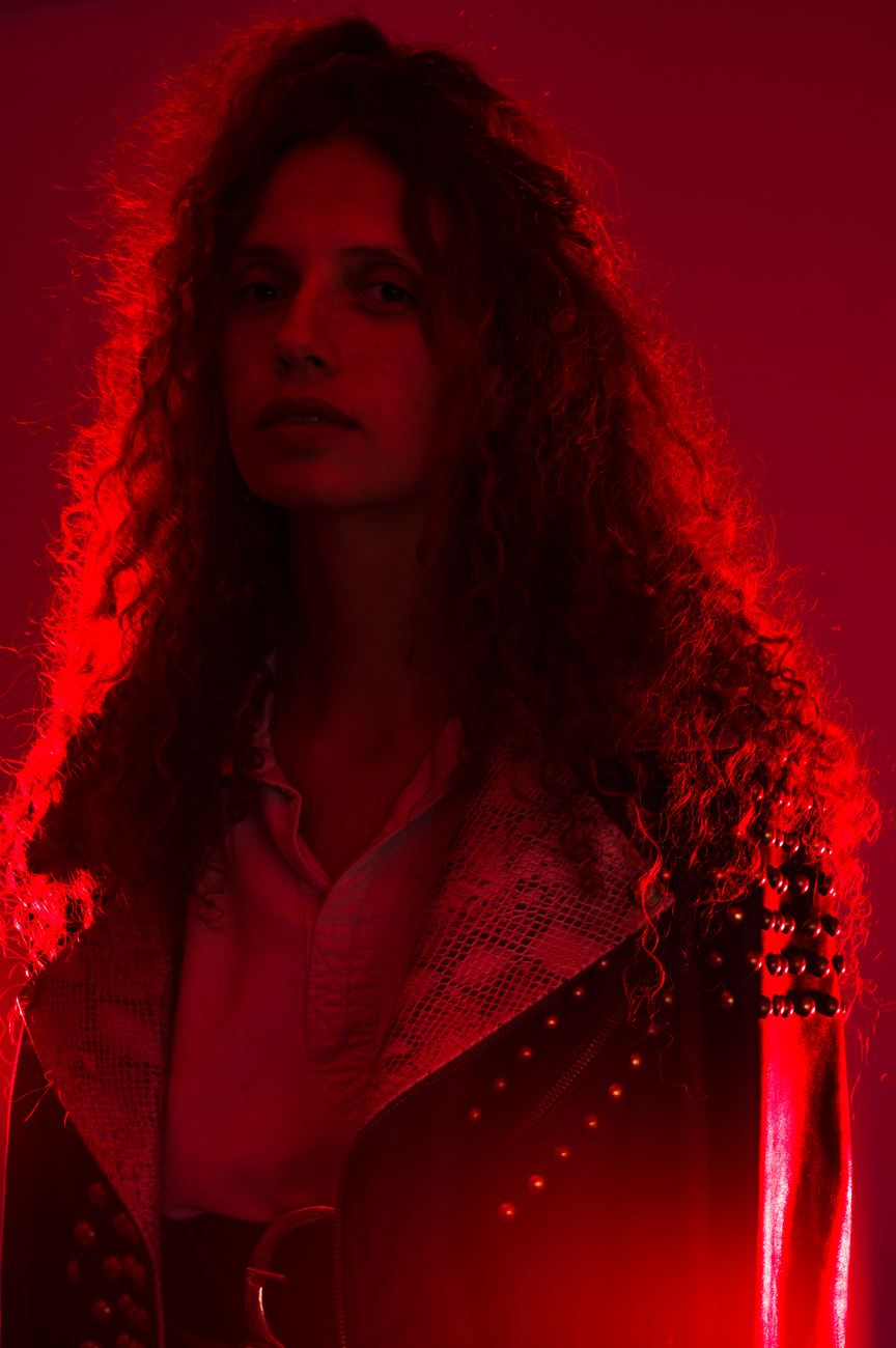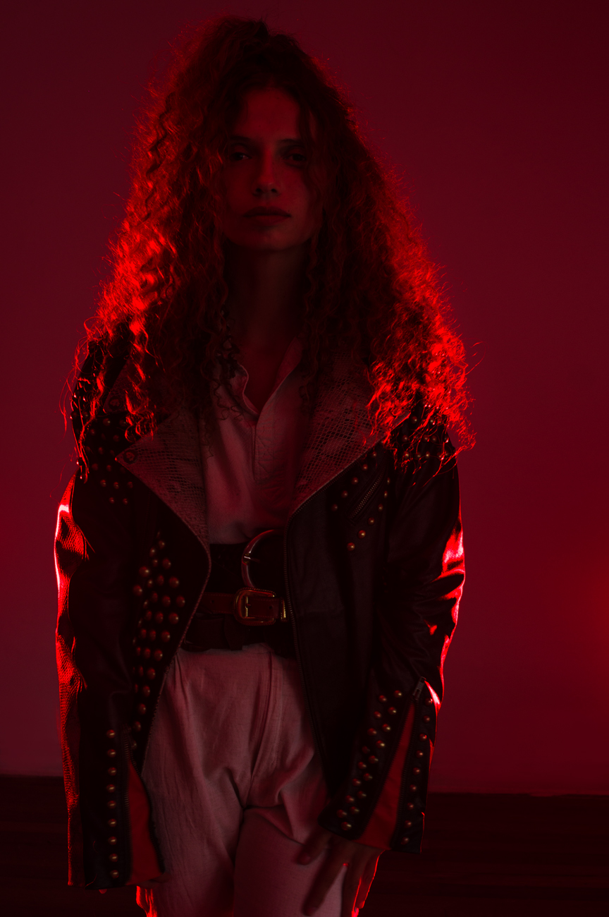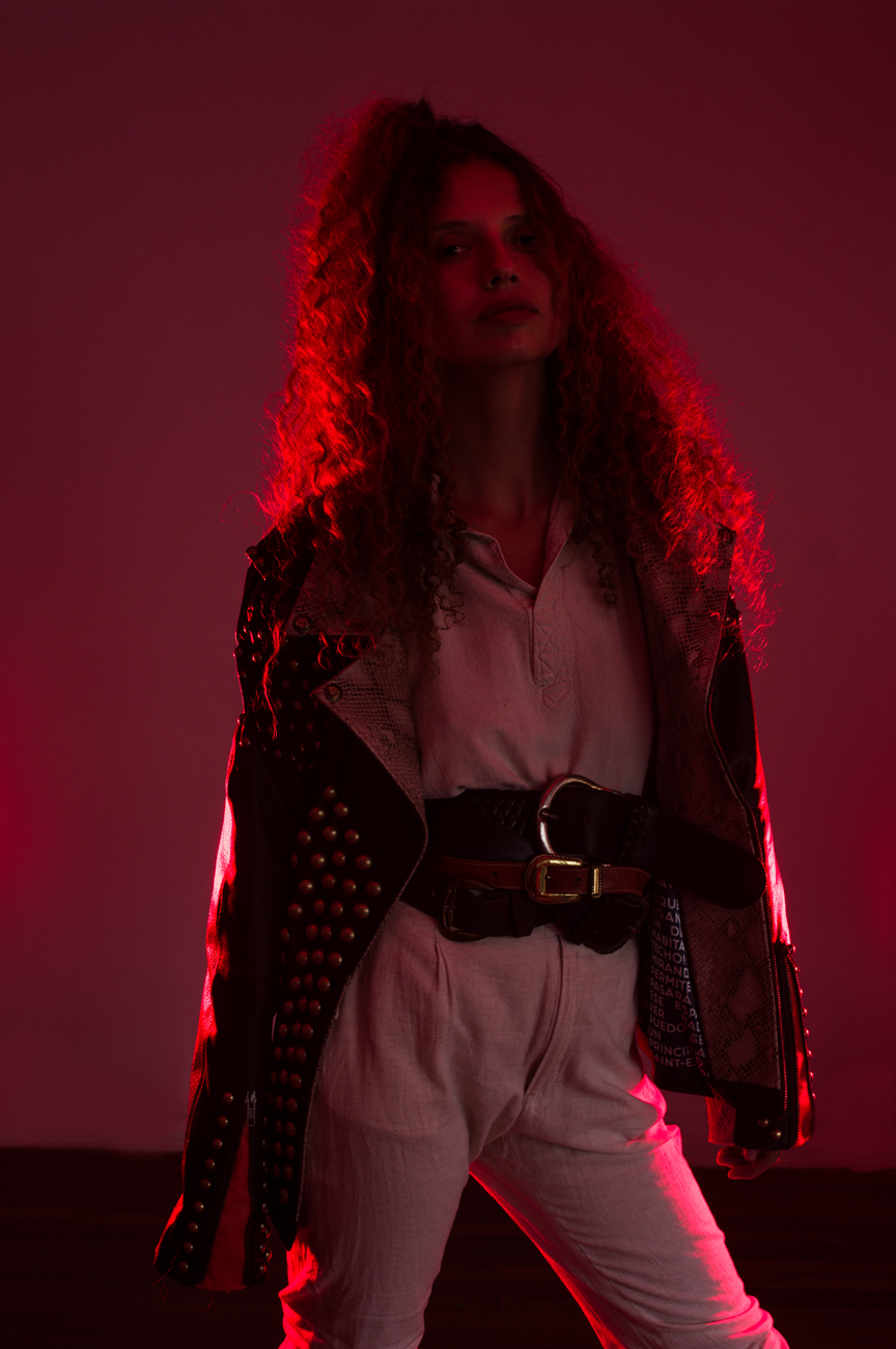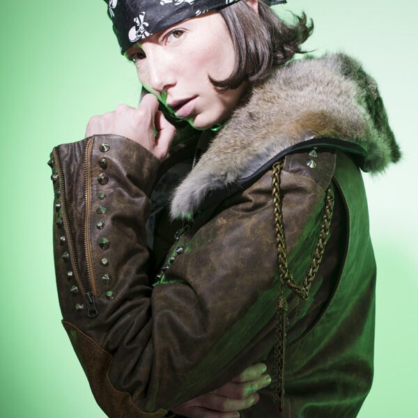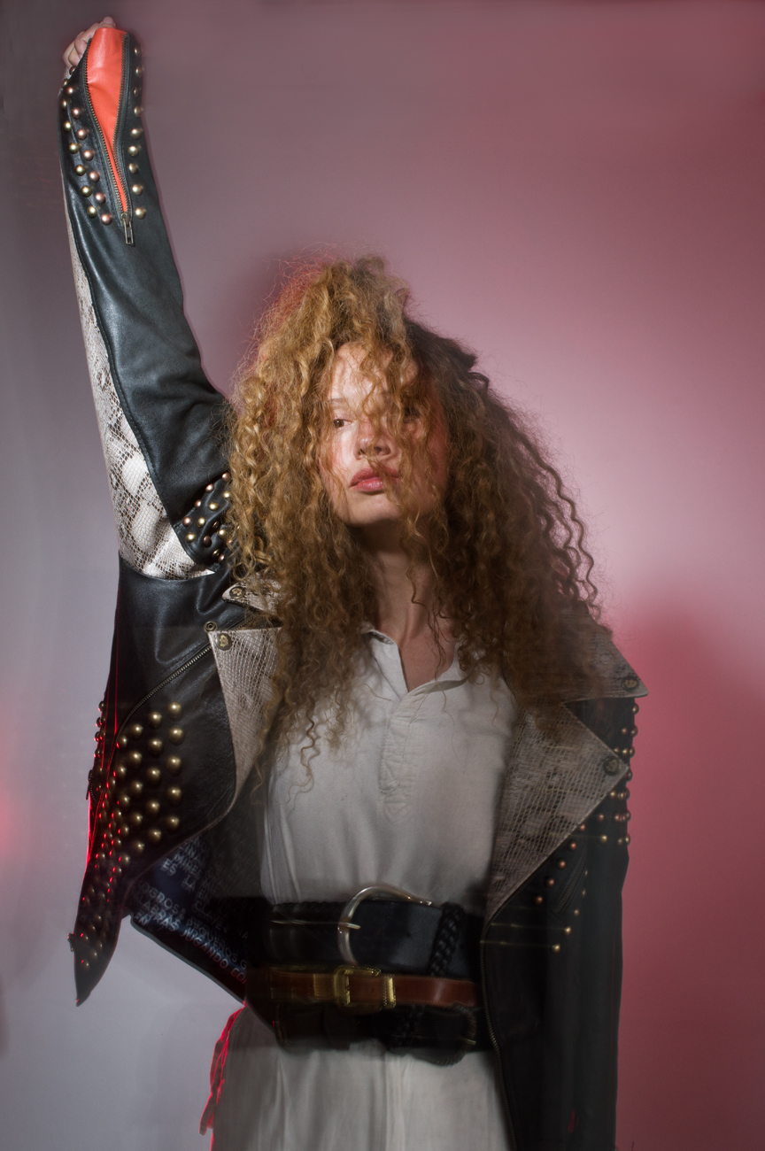 Chamarra en piel natural, suave al tacto, Arte pintado a mano en la espalda por Manuela Restrepo, Herrajes en acero inoxidable importados.